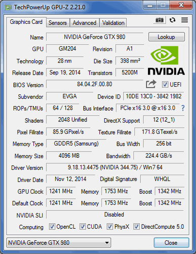 Chipset/GPU ModelNVIDIA GeForce GTX 980