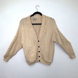 Cladyknit Mens Fisherman Cardigan Sweater XL Cable Wool Aran Ireland Ivory Vtg