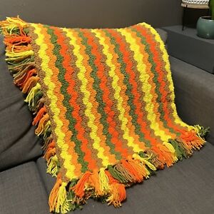 VTG 70s Retro Crochet Afghan Throw Blanket Knit 78”x48” Zigzag Yellow Green